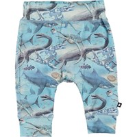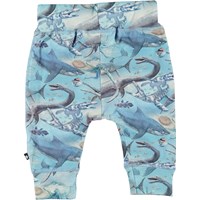 Sammy is een blauw babybroekje van 100% biologisch jersey katoen. Het heeft een brede elastische rib rond de taille en enkels, waardoor het comfortabel zit. De broek is in de Ancient Ocean print waarop zwemmende haaien, octopussen en prehistorische waterdinosaurussen staan.