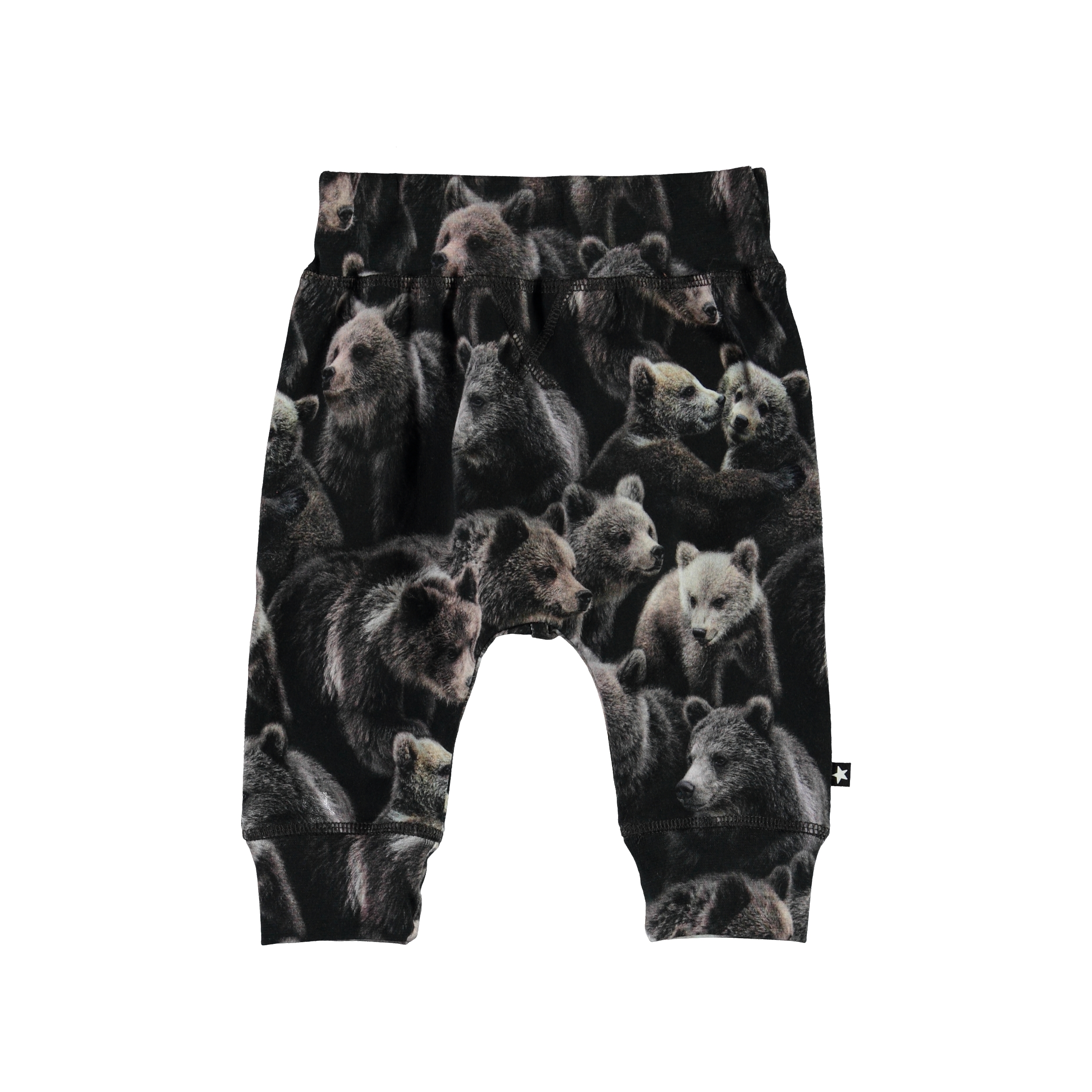 Sammy is een babybroek met een schattige berenprint. Het heeft een brede elastische ribboord rond de taille en pijpen en zichtbare stiksels aan de voorkant voor een joggingbroek look.