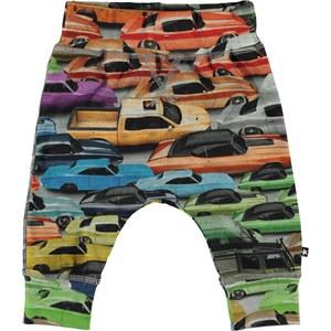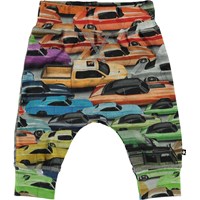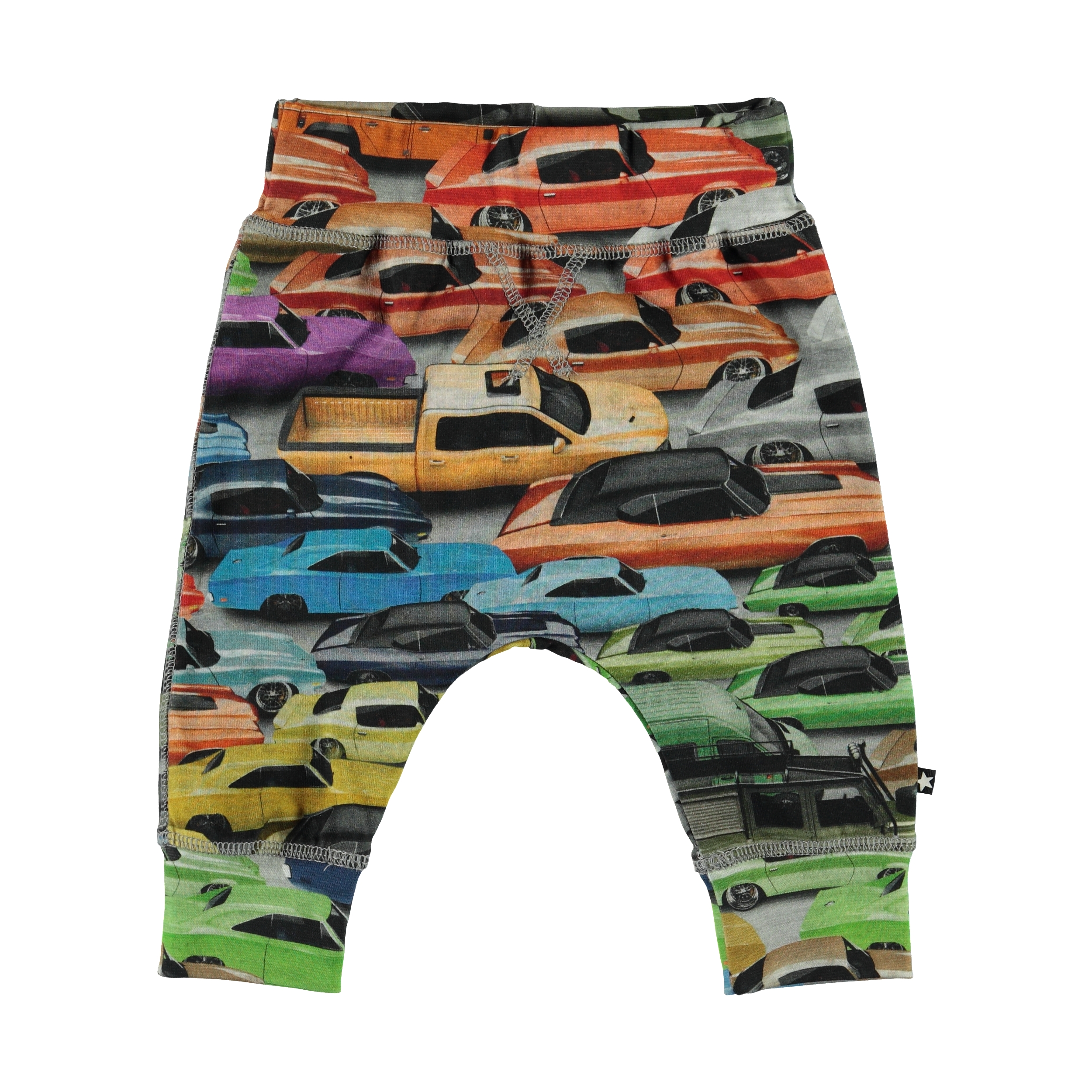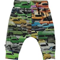 Sammy is een baby joggingbroek met een print van kleurrijke auto's. Het heeft een brede elastische rib in de taille en aan de onderkant.
