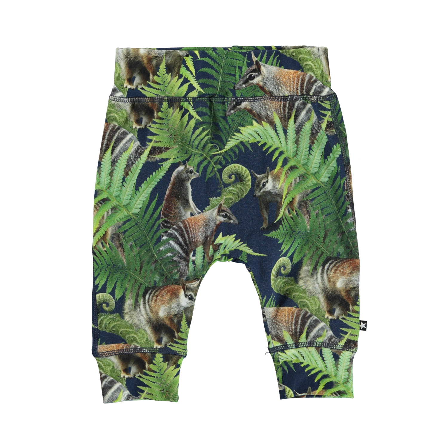 Sammy is een wijde babybroek met de ‘Fern Friends’ print. Het heeft een wijde elastische ribboord rond de taille en pijpen en zichtbare stiksels aan de voorkant wat zorgt voor een joggingbroek look.