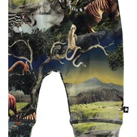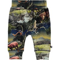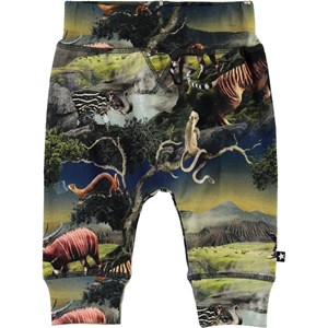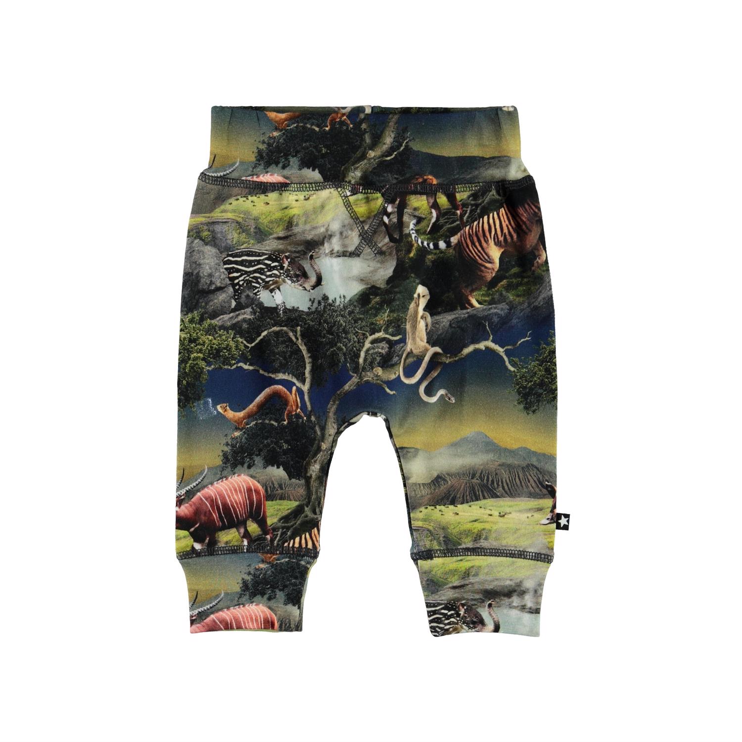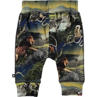 Sammy is een babybroek met een futuristische dierenprint. Het heeft een brede elastische ribboord rond de taille en pijpen en zichtbare stiksels aan de voorkant voor een joggingbroek look.