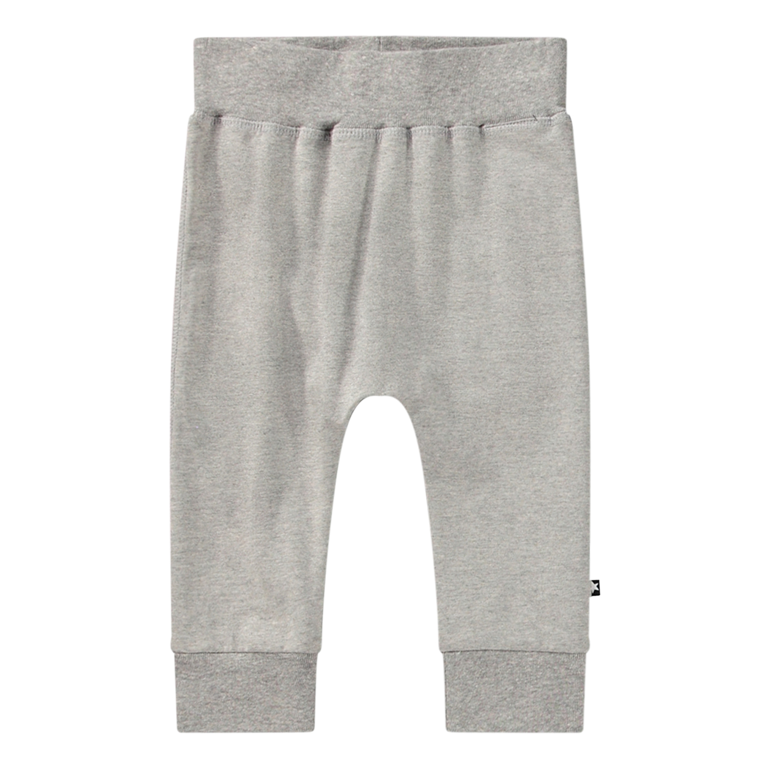 Grijze broek van zachte biologische katoenen jersey voor baby's en peuters. De broek heeft een brede elastische rib rond de taille en pijpen, waardoor het comfortabel is om te dragen en veel bewegingsvrijheid biedt.