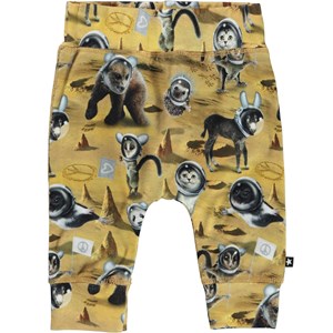 Sammy is een gele wijde babybroek met een print van verschillende dieren die een trip naar de maan maken. Het heeft een wijde elastische ribboord rond de taille en pijpen en zichtbare stiksels aan de voorkant wat zorgt voor een joggingbroek look.