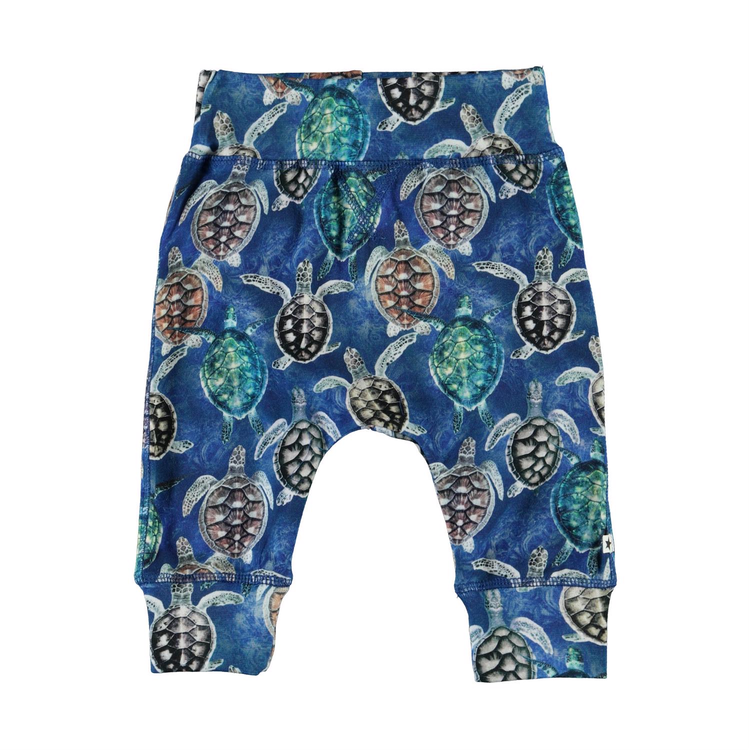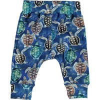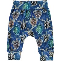 Sammy is een ruime en blauwe babybroek met een schildpaddenprint. Het heeft een joggingbroek look met brede en elastische boorden rond de taille en pijpen.