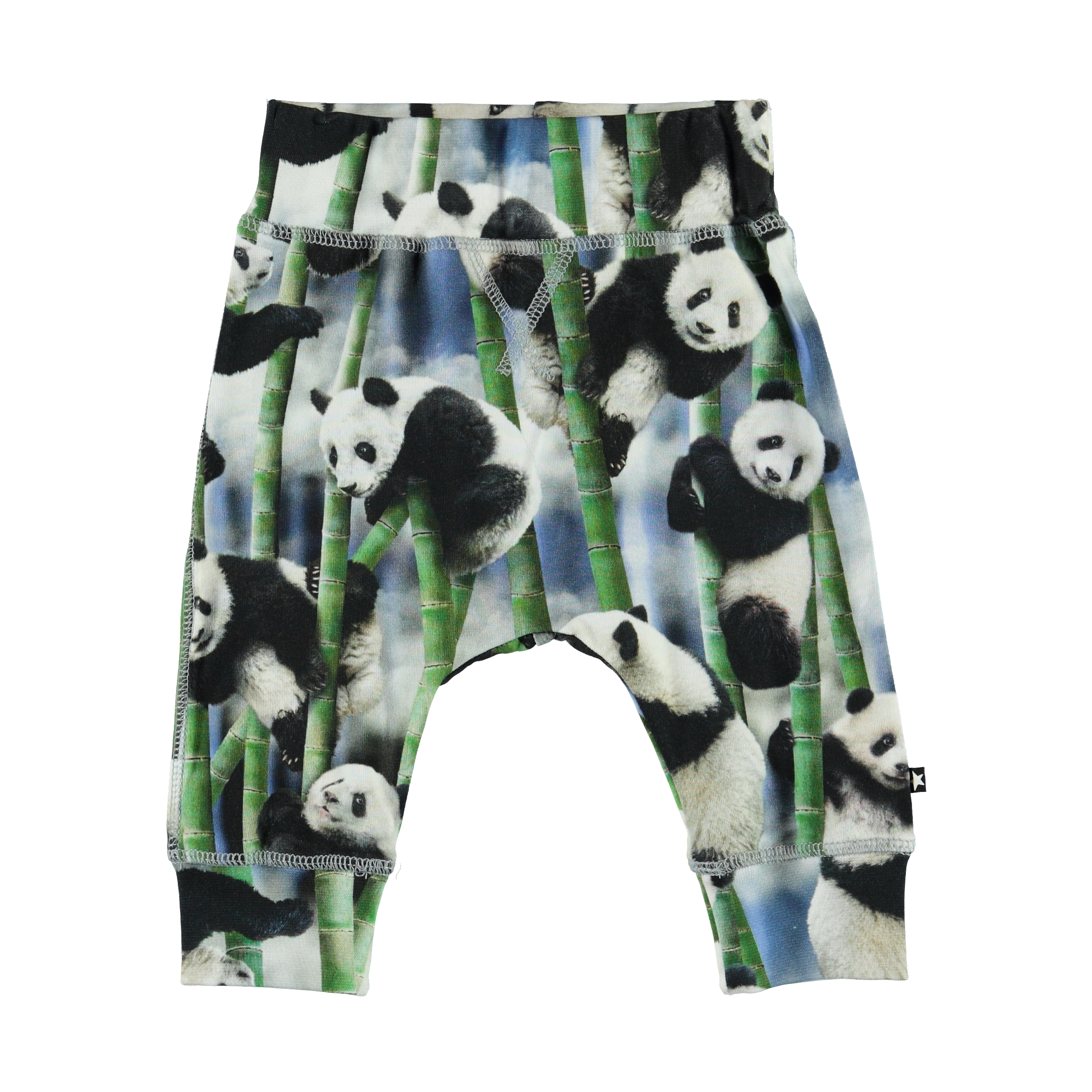 Sammy is een baby joggingbroek met een print van panda’s en hun favoriete eten: bamboe. Het heeft een brede elastische rib in de taille en aan de onderkant.