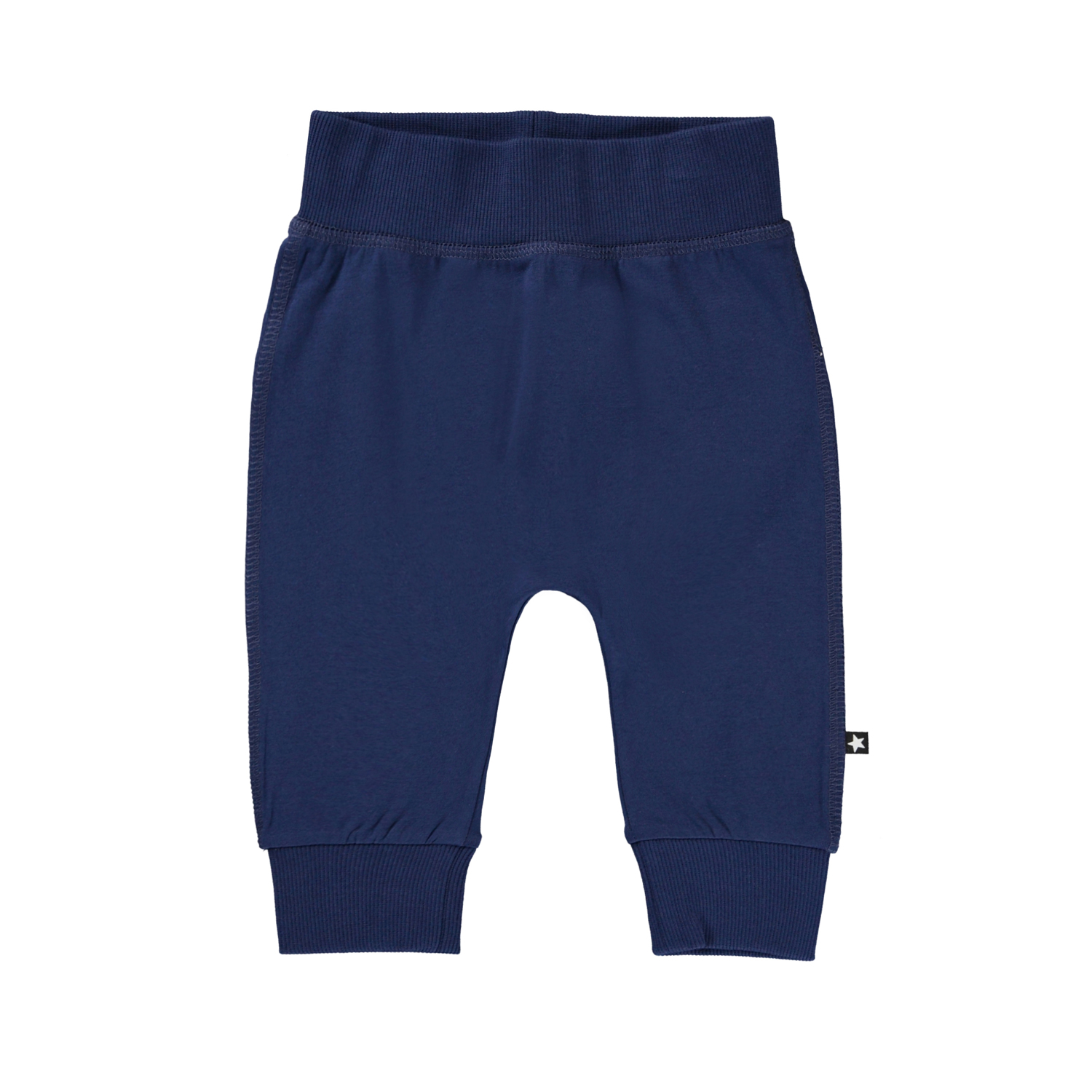 Sammy is een blauwe babybroek. Het heeft een brede elastische ribboord rond de taille en pijpen. De broek heeft zichtbare stiksels aan de voorkant dat zorgt voor een joggingbroek look.