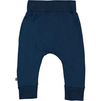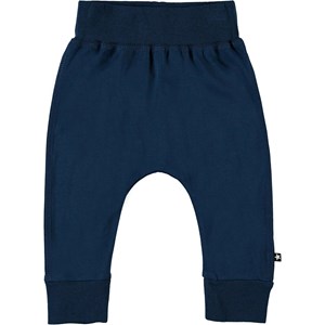 Sammy is een blauwe babybroek. Het heeft een brede elastische ribboord rond de taille en pijpen en zichtbare stiksels aan de voorkant waardoor het een joggingbroek look heeft.