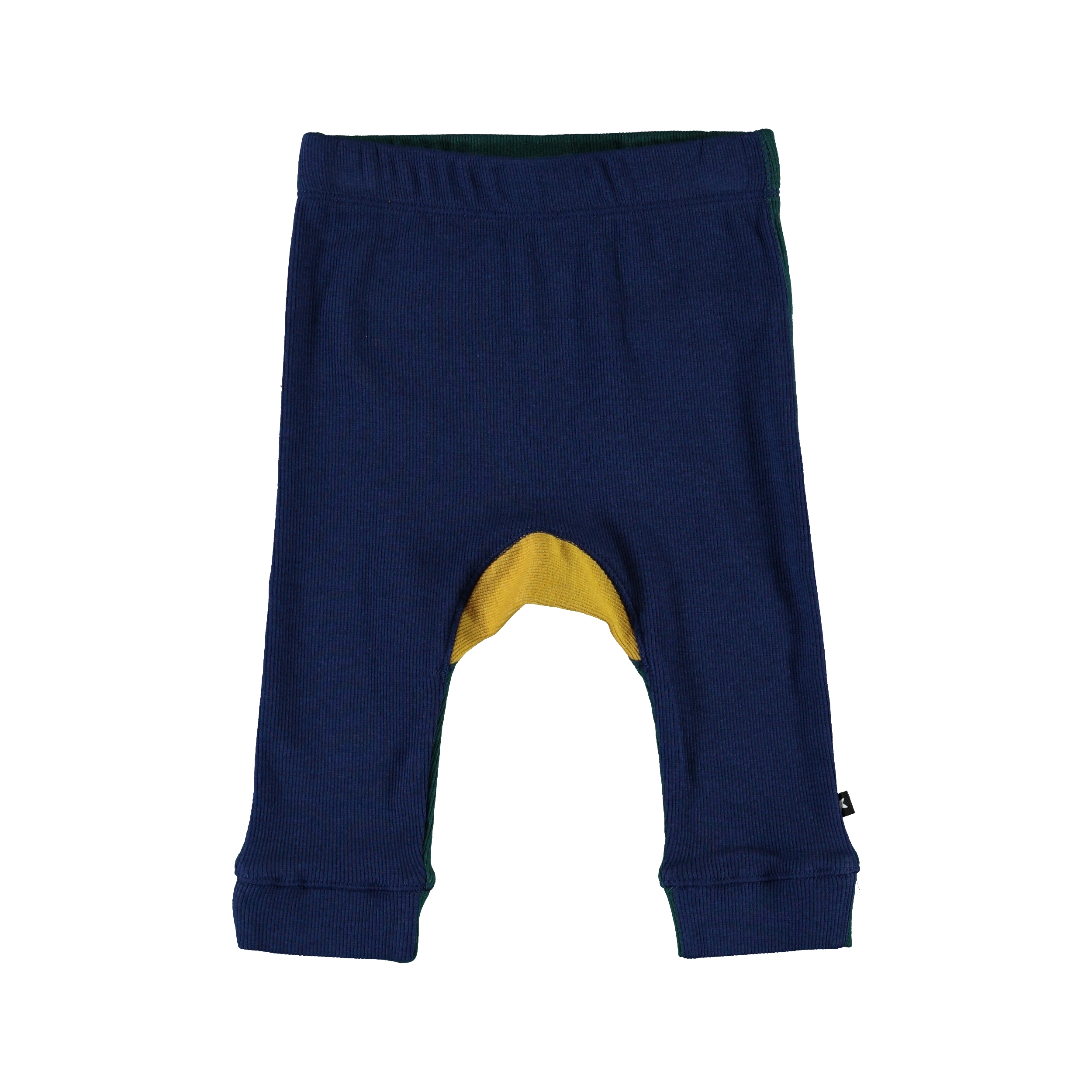 Seb is een groen, blauw en geel geblokte babybroek. Seb heeft smalle pijpen en ribboord. het heeft een elastische taille voor een comfortabele pasvorm.