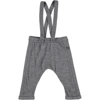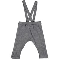 Grijze wollen babybroek met afneembare bretels en omgeslagen boord rond de enkels.