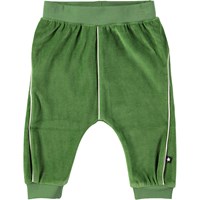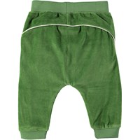 Groene babybroek in fluweel met witte strepen aan de zijkant en wijde elastische boord aan de taille en pijpen.