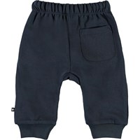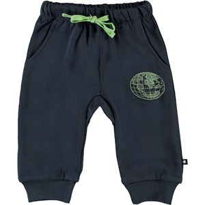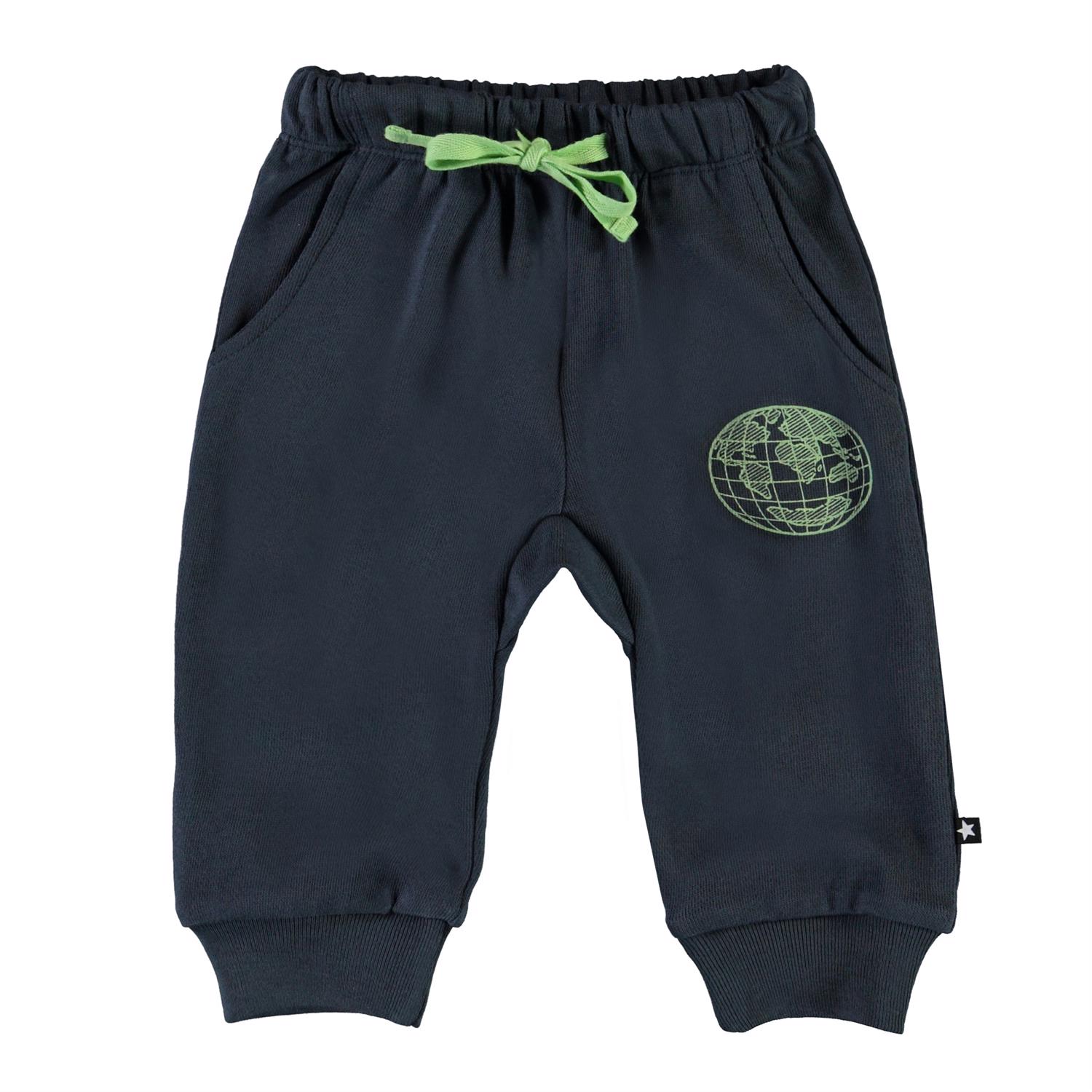 Simme is een zachte en comfortabele babybroek in donkerblauw met een kleine print van de Aarde. Het heeft witte koordjes in de taille.