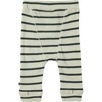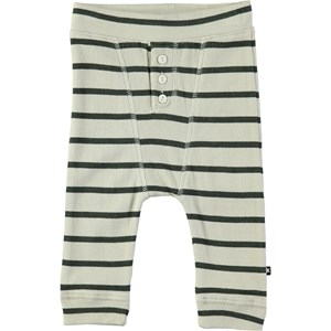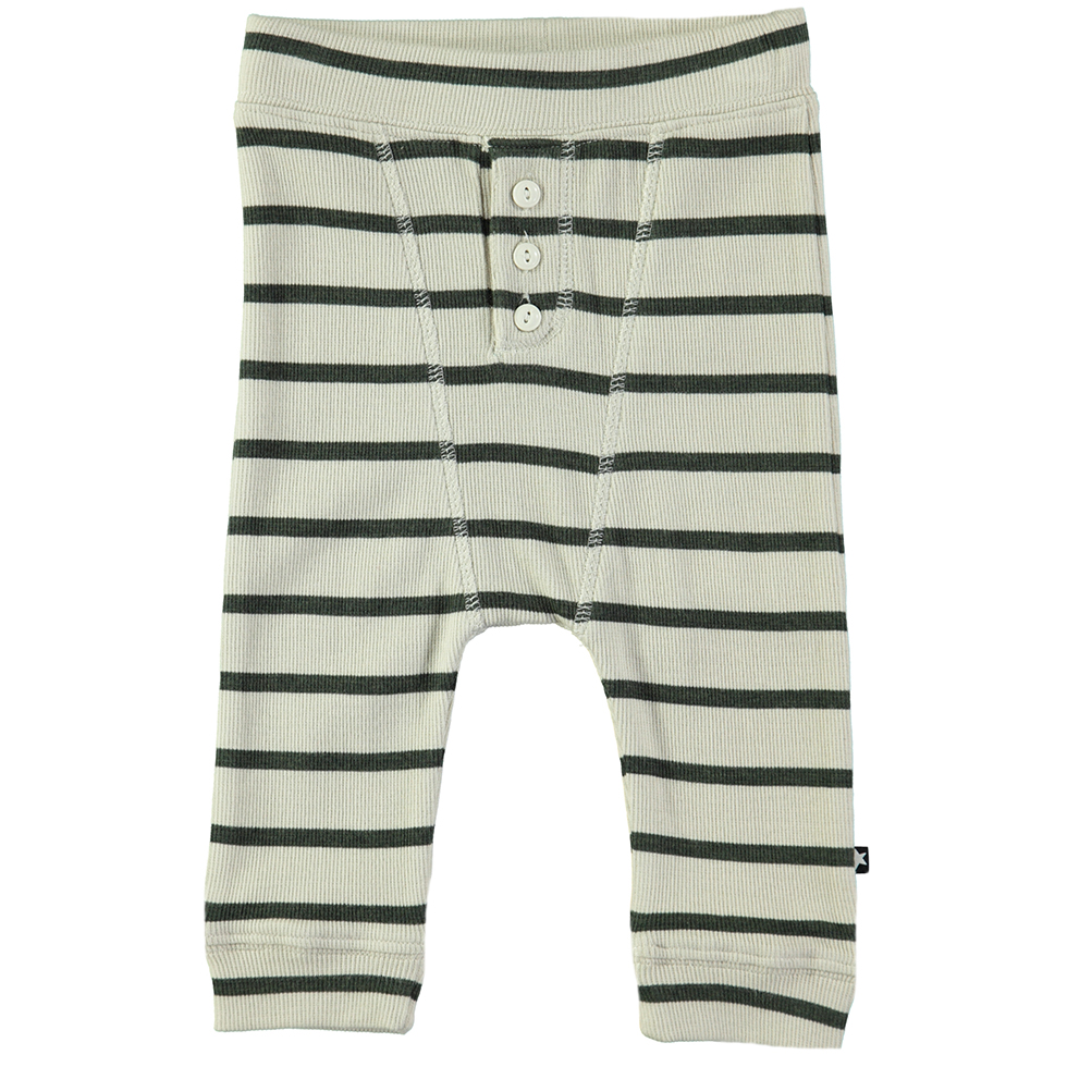 Zachte gestreepte babybroek in ribstof met decoratieve knopen aan de voorzijde. De broek heeft een iets brede rand in de taille en de pijpen.
