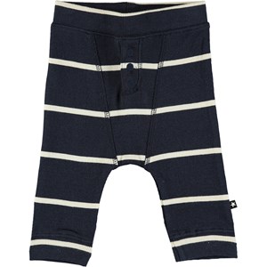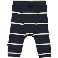Gestreepte donkerblauwe babybroek in ribstof met decoratieve knopen aan de voorzijde. De broek heeft een iets brede rand in de taille en de pijpen.