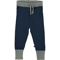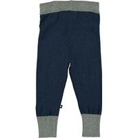 Gebreide katoenen babybroek in twee kleuren en een ribboord rond de taille en de pijpen.