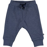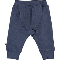 Donkerblauwe baby joggingbroek met een verlaagd kruis en een elastische taille met gestreepte koordjes. De joggingbroek heeft een zachte binnenzijde en ribboord rond de enkels.