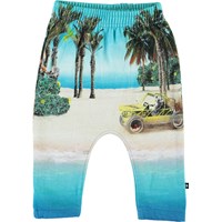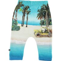 Storm is een turquoise baby joggingbroek met een print van een strand, palmbomen en koala beren. Het heeft een brede elastische taille die voor een goede pasvorm zorgt.