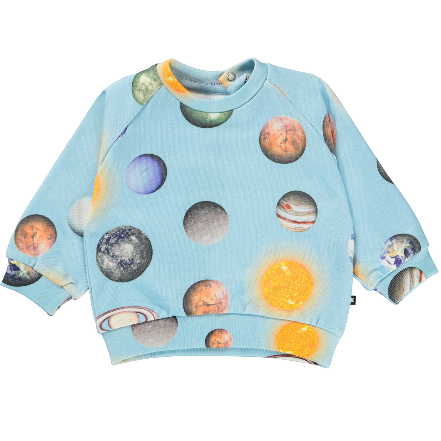 Disc is een lichtblauwe babysweater met een print van planeten. De sweater heeft drukknopen aan de achterkant.