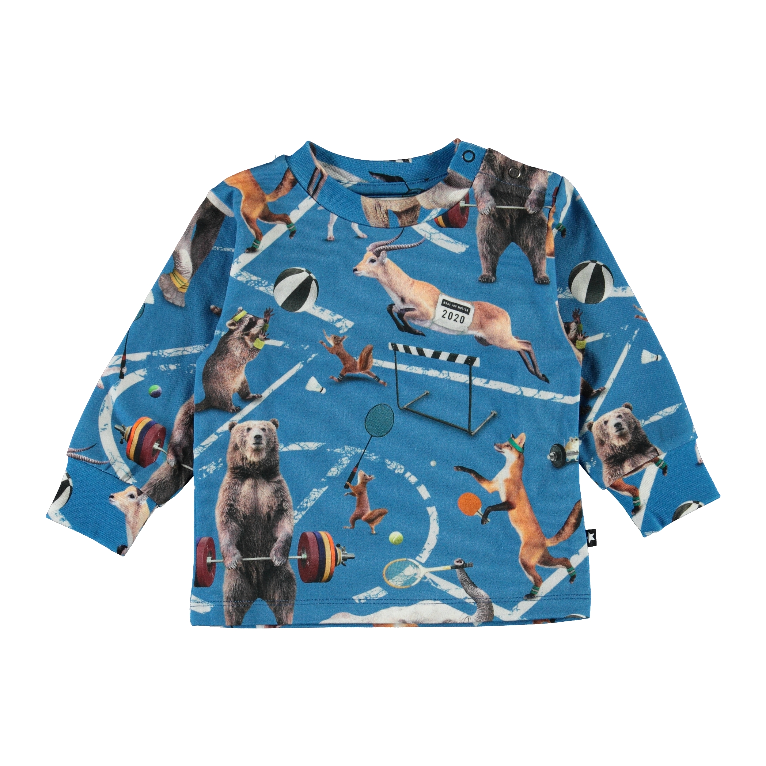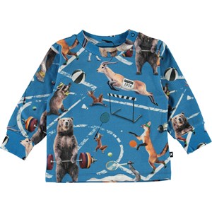 Eloy is een lichtblauwe babytrui met een print van verschillende dieren die sporten. Eloy heeft een drukknopen op één schouder en blauwe mouwen en achterkant.