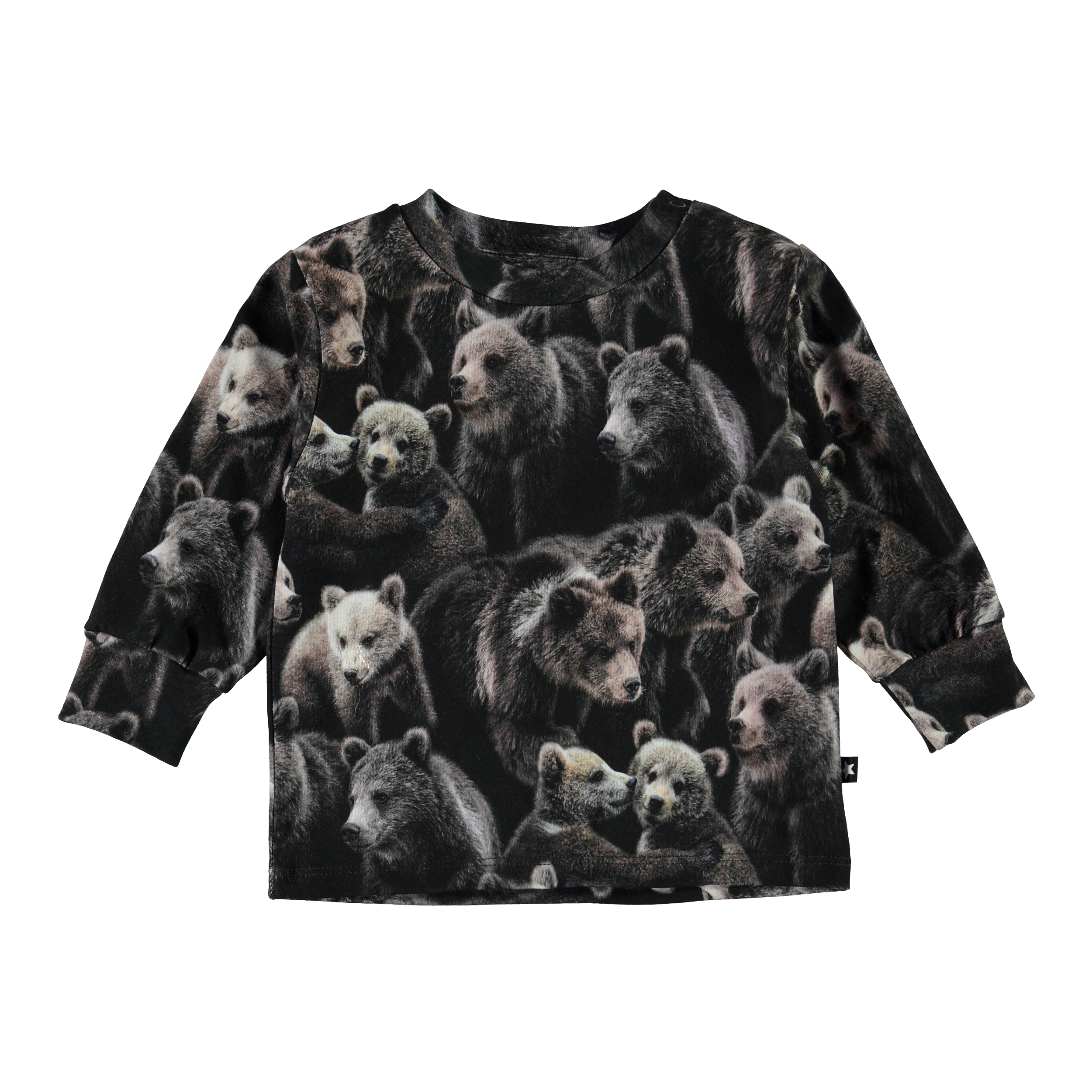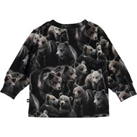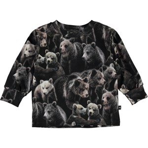 Eloy is een babytrui met een print van heel veel schattige beren. Eloy heeft een drukknopen op één schouder en blauwe mouwen en achterkant.