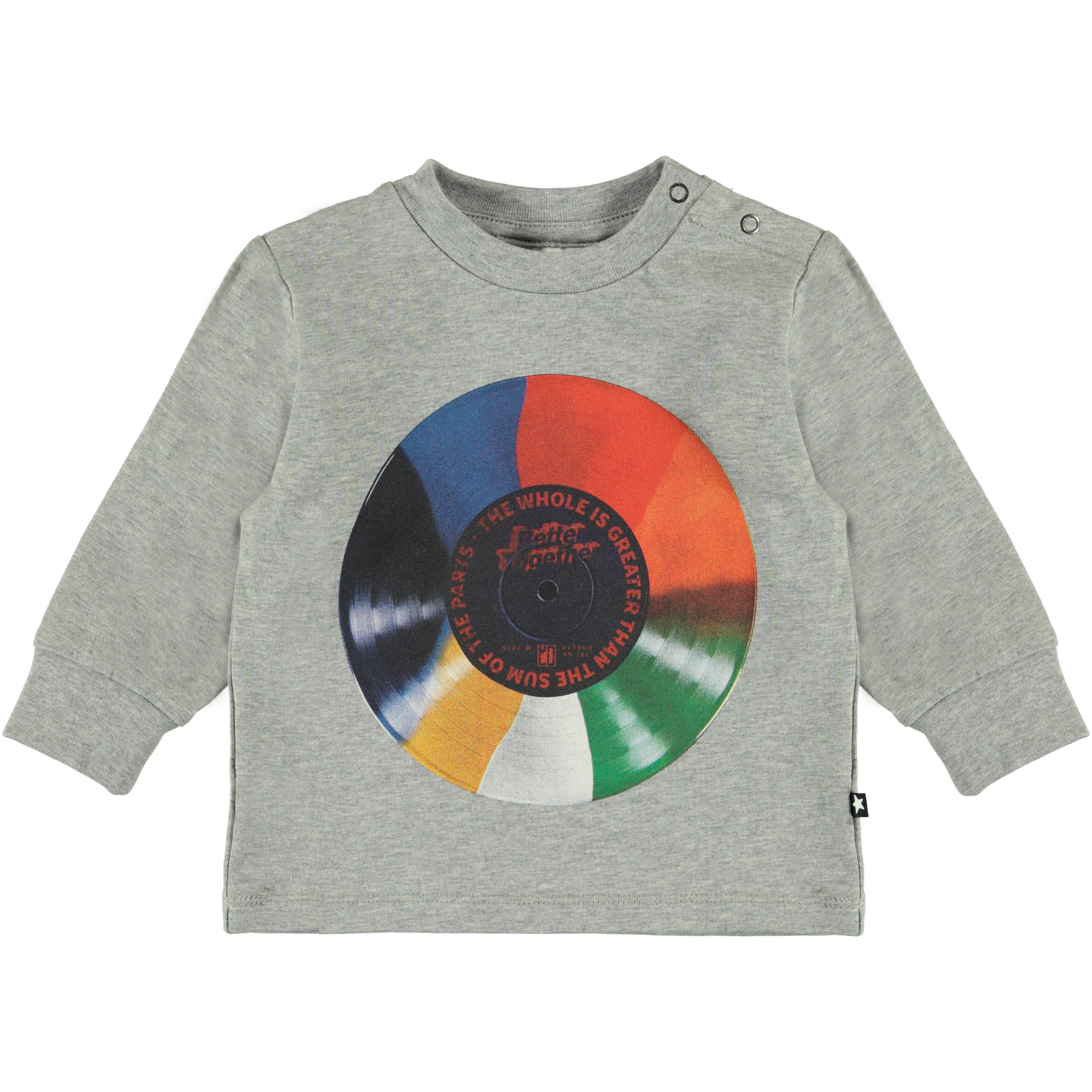 Eloy is een grijs baby shirt met een kleurrijke LP print op de voorkant. Het shirt heeft een drukknoop op één schouder.