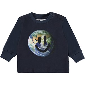 Eloy is een donkerblauwe babysweater met op de voorkant een print van de aarde met een smiley. Eloy heeft drukknopen op een schouder voor het eenvoudig aantrekken.