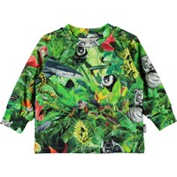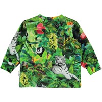 Eloy is een blauw babyshirt met een ‘Fantasy Jungle’ print van verschillende dieren die normaal niet in de jungle leven. Eloy heeft drukknopen op één schouder.