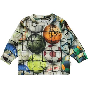 Eloy is een babyshirt met een print van kleurrijke voetballen achter een net. Eloy heeft drukknopen op één schouder.