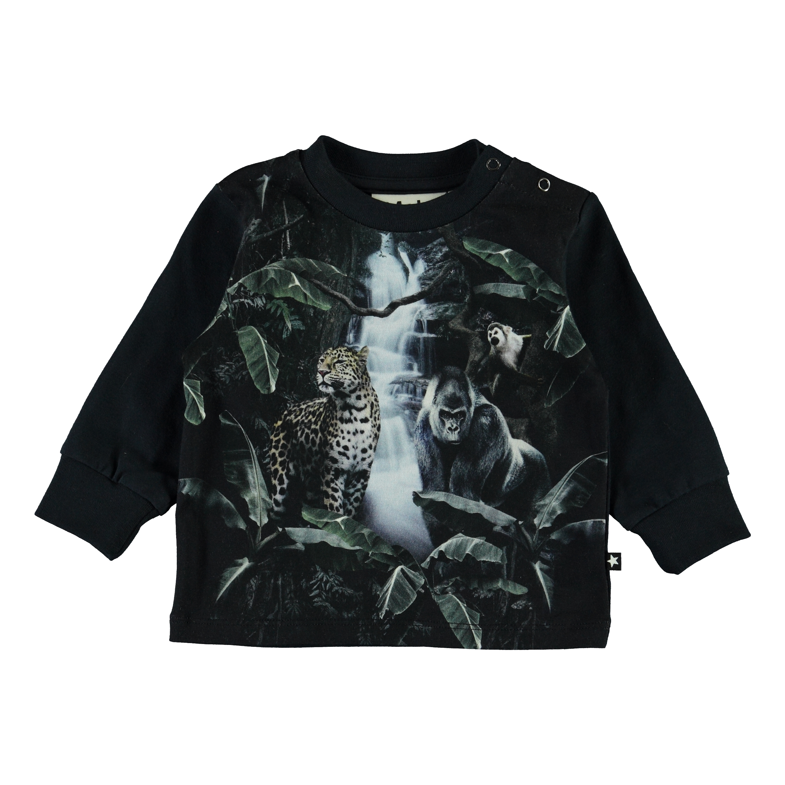Eloy is een babytrui met een print van jungledieren in het donker. Eloy heeft drukknopen op één schouder en blauwe mouwen en achterkant.