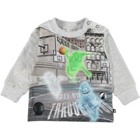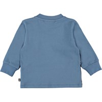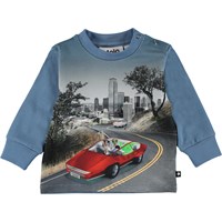 Eloy is een babytrui met een print van een zelfrijdende auto met een geest, een alien en een hond, die een passagier is. Eloy heeft een knoopsluiting op één schouder en blauwe mouwen en achterkant.
