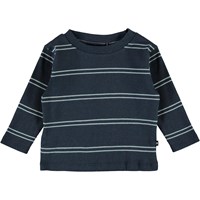 Elvo is een blauw gestreepte babyshirt met lange mouwen.