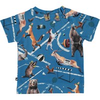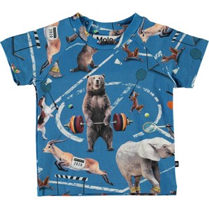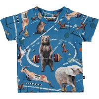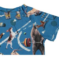 Emmett is een katoenen baby t-shirt in de ‘Atheletic Animals’ print, met verschillende dieren die sporten. Emmett heeft drukknopen in de hals voor het eenvoudig aantrekken.