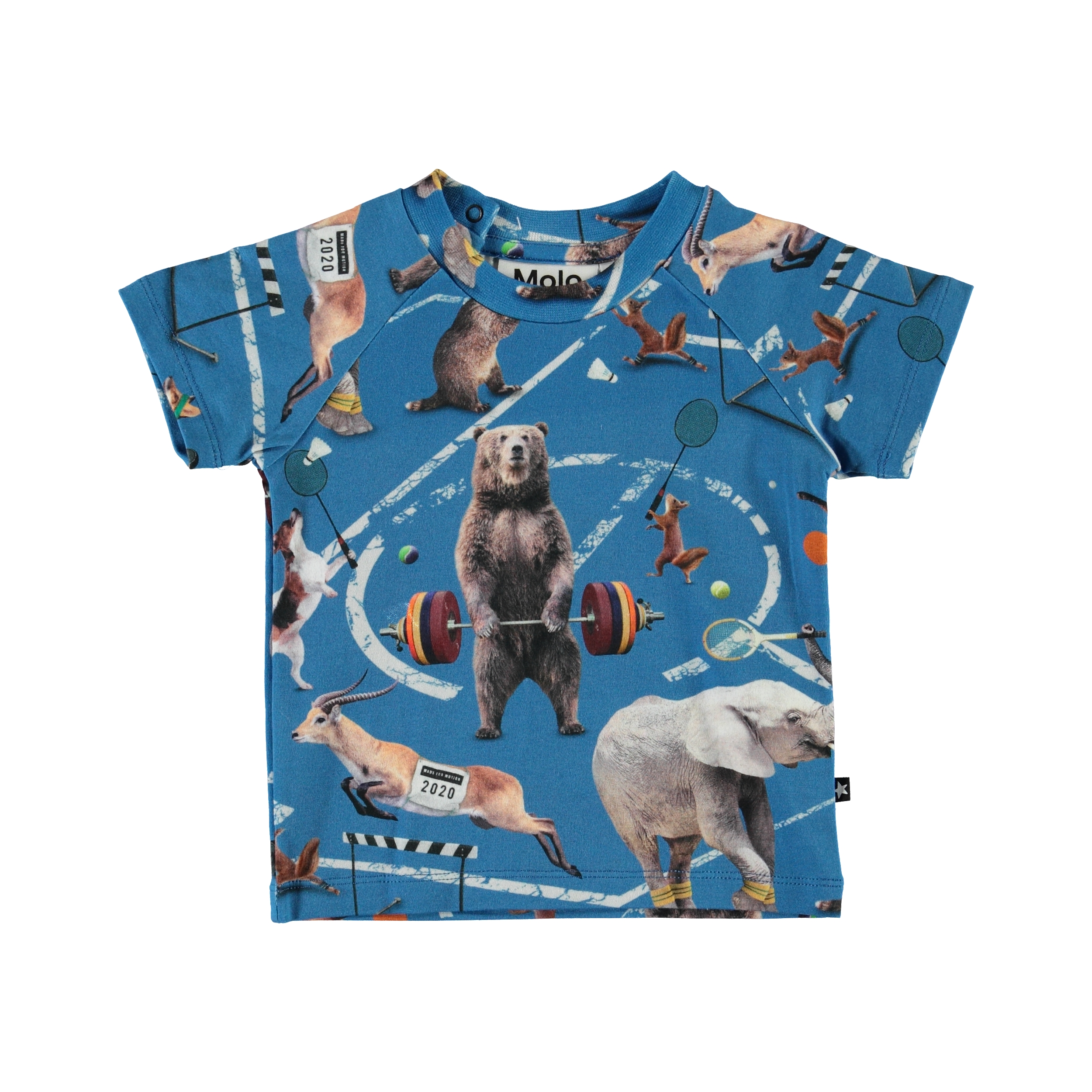 Emmett is een katoenen baby t-shirt in de ‘Atheletic Animals’ print, met verschillende dieren die sporten. Emmett heeft drukknopen in de hals voor het eenvoudig aantrekken.