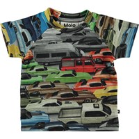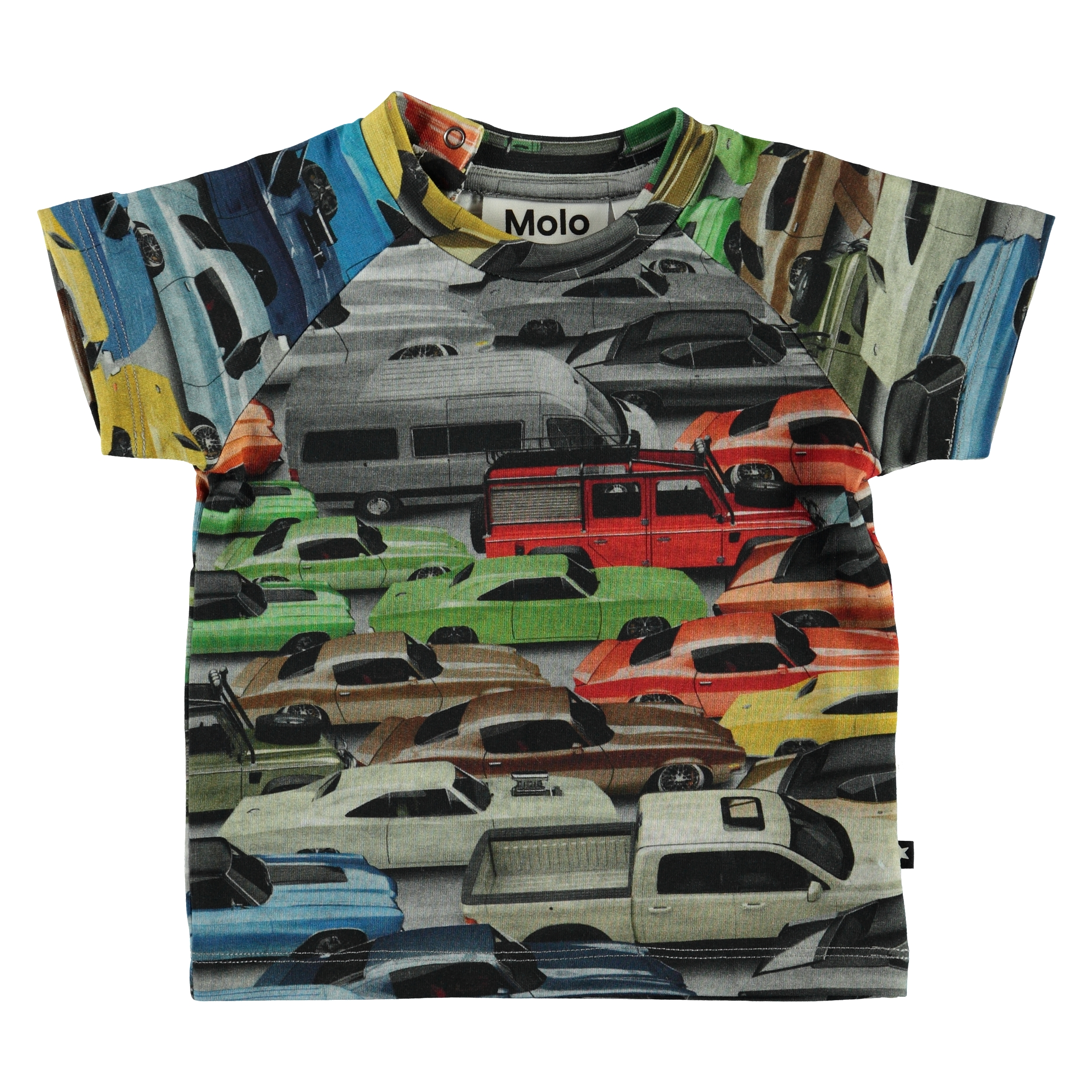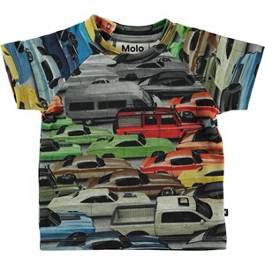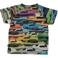 Een overvloed aan kleurrijke auto's bedekken de print op de voorkant van het Emmett baby t-shirt. Emmett heeft een drukknoop in de nek