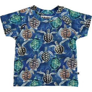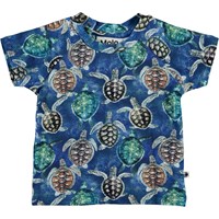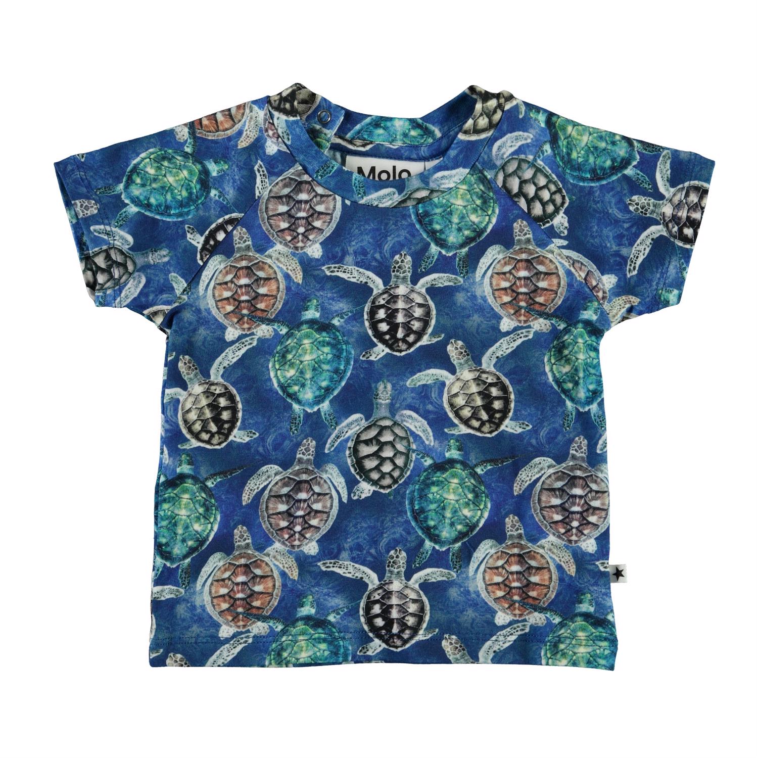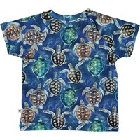 Emmett is een blauwe katoenen baby t-shirt met een schilpaddenprint. Emmett heeft drukknopen aan de achterkant.