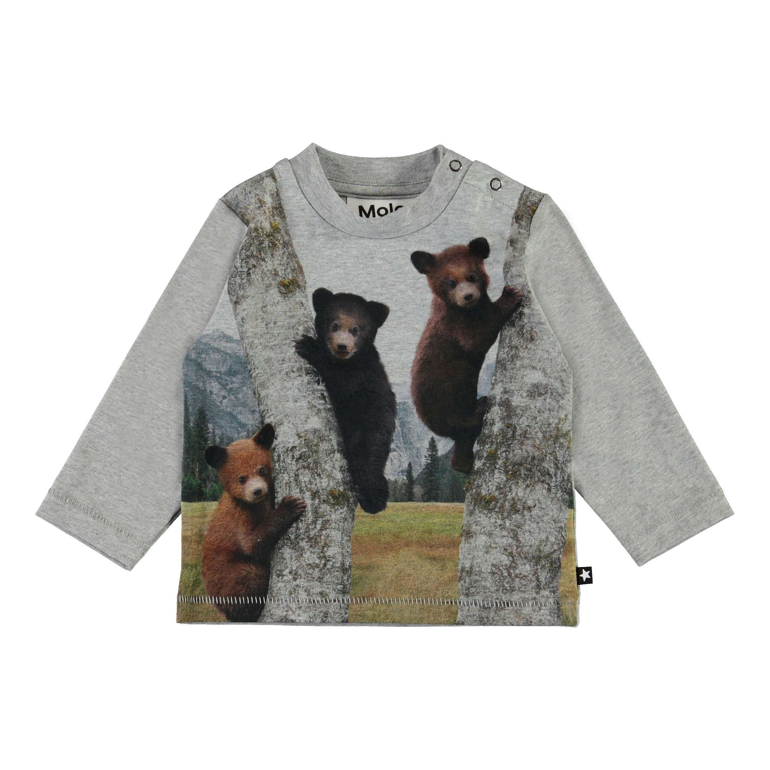 Enovan is een grijze babyshirt met een beerprint. Enovan heeft drukknopen op één schouder en donkerblauwe mouwen en achterkant.