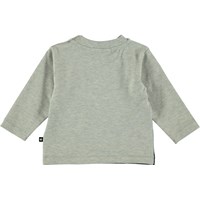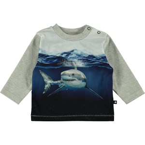 Neem een diepe duik onder water en botst tegen een glimlachende haai op de "Friendly Shark"  print. Enovan is een baby trui met grijze mouwen en een drukknoop op één schouder.