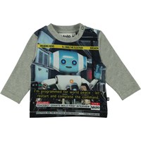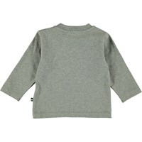 Grijs shirt met lange mouwen en een print op de voorkant. Het heeft een eenvoudige drukknoop sluiting in de nek.