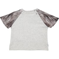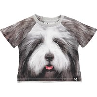 Grijs babyshirt met korte mouwen, een digitale hondenkop op de voorkant en mouwen en geribde boorden aan de hals. Het shirt heeft een praktische drukknoop aan de hals.