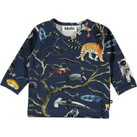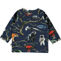 Verken de 'Tree of Life’ print op het blauwe Ewald babyshirt. Wilde dieren en aliens zijn verborgen in de print. Ewald heeft raglanmouwen en een drukknoop.