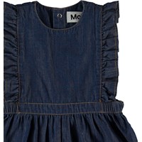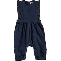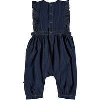 Fabia is een mouwloos babypakje met lange pijpen in een donkerblauwe spijkerstof. Het Fallon babypakje heeft ruches aan de voorkant. Het heeft drukknopen in de boord en in het kruis.