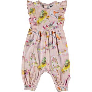 Fallon is een mouwloze babypakje met ruches op de schouders. Het babypakje heeft een ijsjes print. Molo heeft deze bloemen bevroren voor het maken van deze print. Het heeft drukknopen aan de achterkant en in het kruis.