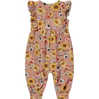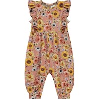Roze babypakje met bloemenprint. Het is mouwloos en heeft een ruche rand op de schouders. Het pakje heeft een drukknopen in de nek en tussen de benen.