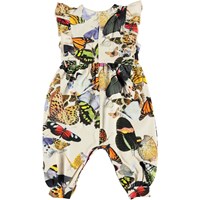 Fallon is een babypak met lange pijpen in een caleidoscoop print van vlinders . Het pak heeft ruches rond de armsgaten en drukknopen in de nek en in het kruis.