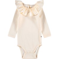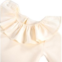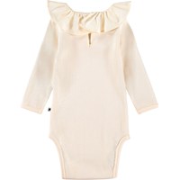 Roomkleurig rompertje voor de kleintjes gemaakt van geribbeld biologisch katoen met lange mouwen. Het rompertje heeft een popeline kraag, drukknopen aan de achterkant en in het kruis voor het gemakkelijk aan- en uitkleden.