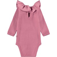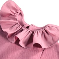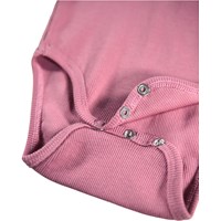 Lichtroze rompertje voor de kleintjes gemaakt van geribbeld biologisch katoen met lange mouwen. Het rompertje heeft een popeline kraag, drukknopen aan de achterkant en in het kruis voor het gemakkelijk aan- en uitkleden.