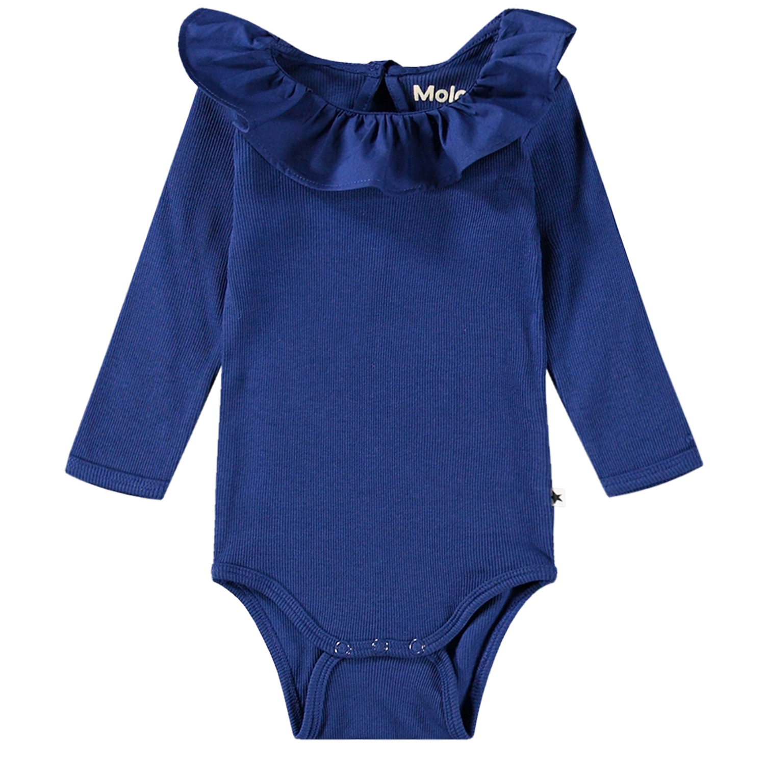 Marineblauwe rompertje met lange mouwen en een schattige poplin kraag van geribbeld biologisch katoen. Het heeft drukknopen aan de achterkant en in het kruis, waardoor het gemakkelijk aan en uit te trekken is.