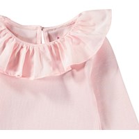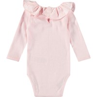 Roze romper met lange mouwen van biologisch ribkatoen voor de kleintjes. De romper heeft een schattige poplin kraag, knoopsluiting aan de achterkant en drukknopen in het kruis voor het makkelijk aankleden.