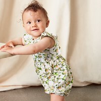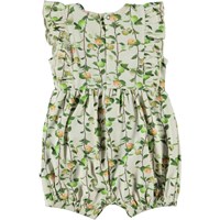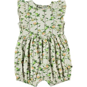 Felicia is een crème-groene babypakje van 100% biologisch jersey katoen. Het babypakje is mouwloos en heeft ruches aan de voor- en achterkant van de top. Felicia heeft korte pijpjes met drukknopen op de schouder en tussen de benen. Felicia is in de Apples Mini print, waarop je appelboomtakken vol appels ziet.