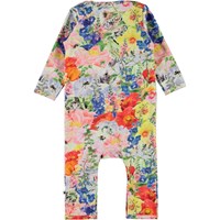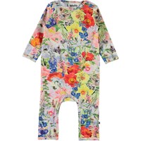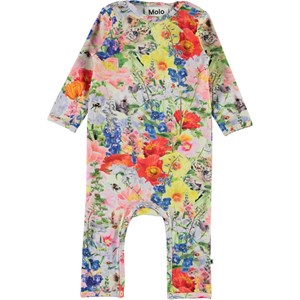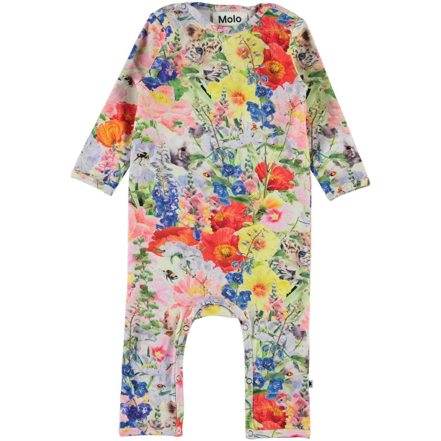 Fiona is een babypakje met een print van verschillende dieren die zich verstoppen tussen de bloemen. Het heeft drukknopen op de schouders en langs de pijpen.