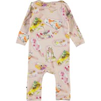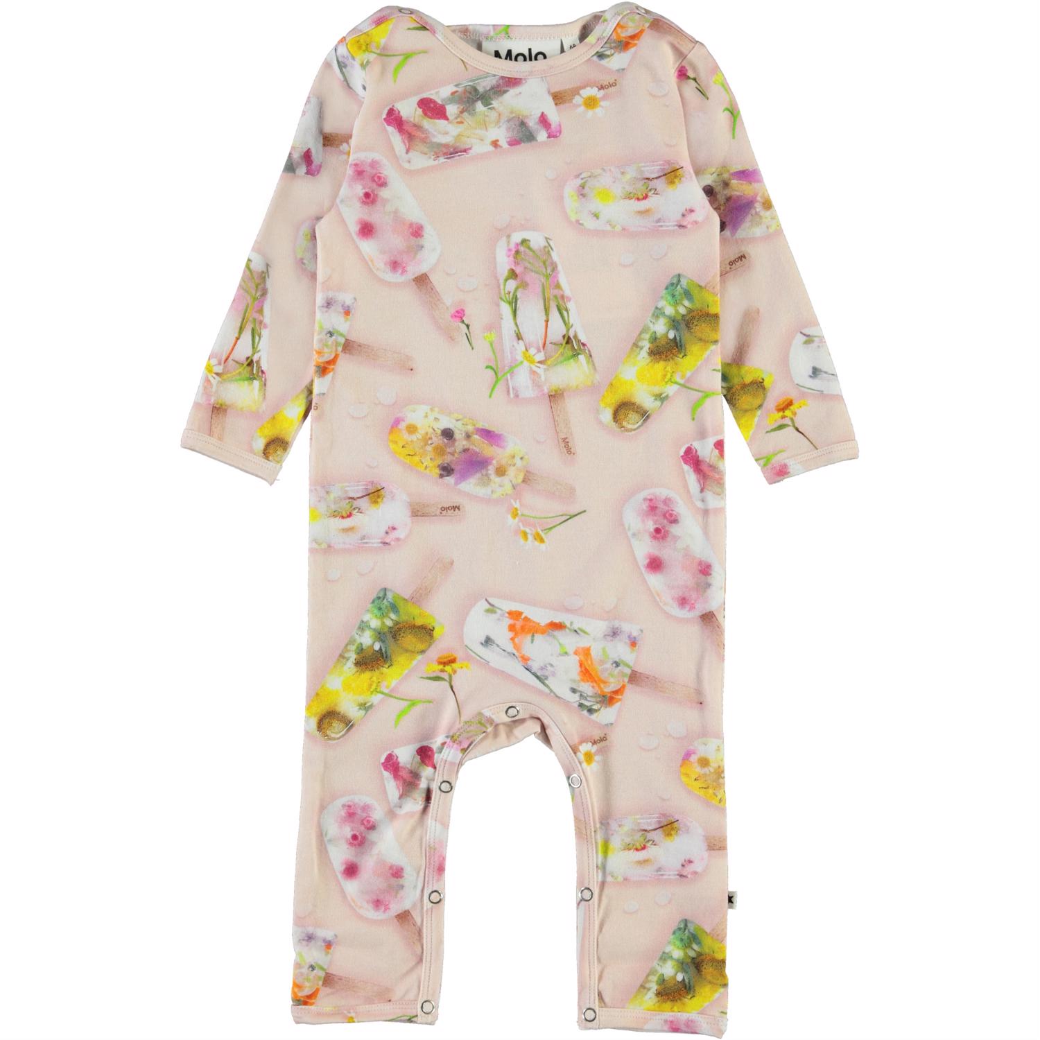 Fiona is een roze babypakje met een ijsjes print. Molo heeft deze bloemen bevroren voor het maken van deze print. Het heeft drukknopen op de schouders en langs de pijpen.